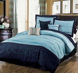 Each set contains a comforter, two matching king shams, two euro shams, one bed skirt and two decorative pillows.